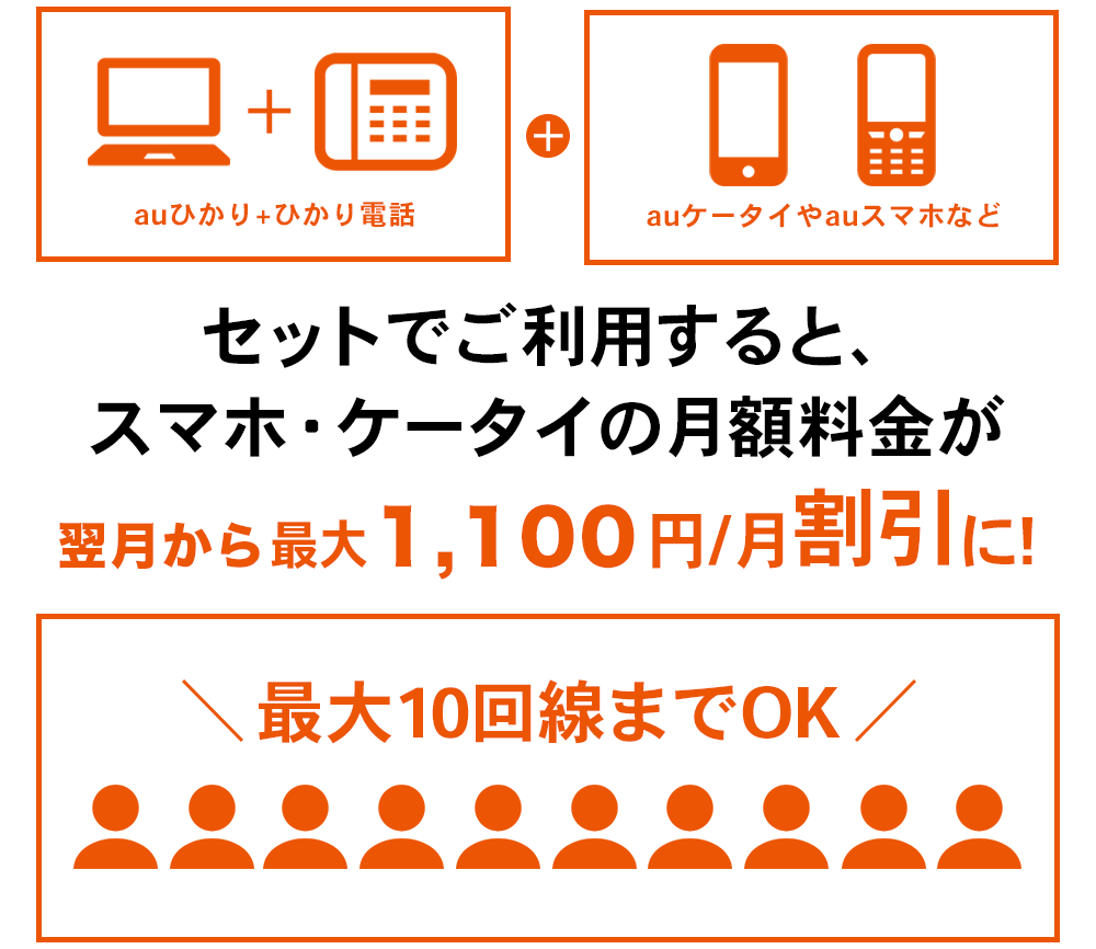 auスマートバリューは、ご利用されているauのスマホ代が1回線ごとに最大1,100円割引される特典です!最大なんと10回線まで割引可能です!