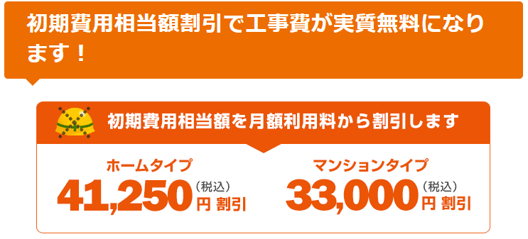 | 工事費 | 33,000円※全額割引 | 41,250円※全額割引 |